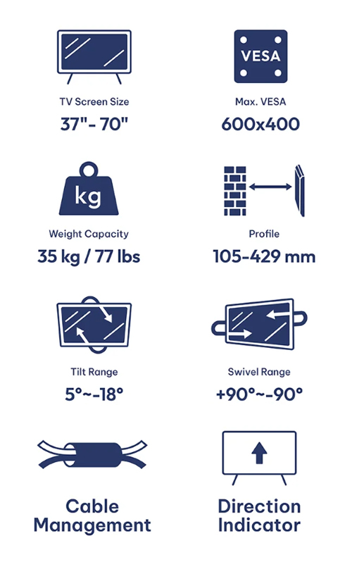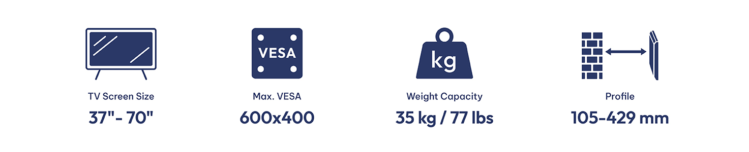 | Metal Sheet Thickness: | Bracket Arm: 1.5mm VESA Plate: 1.8mm Wall Plate: 1.8mm |